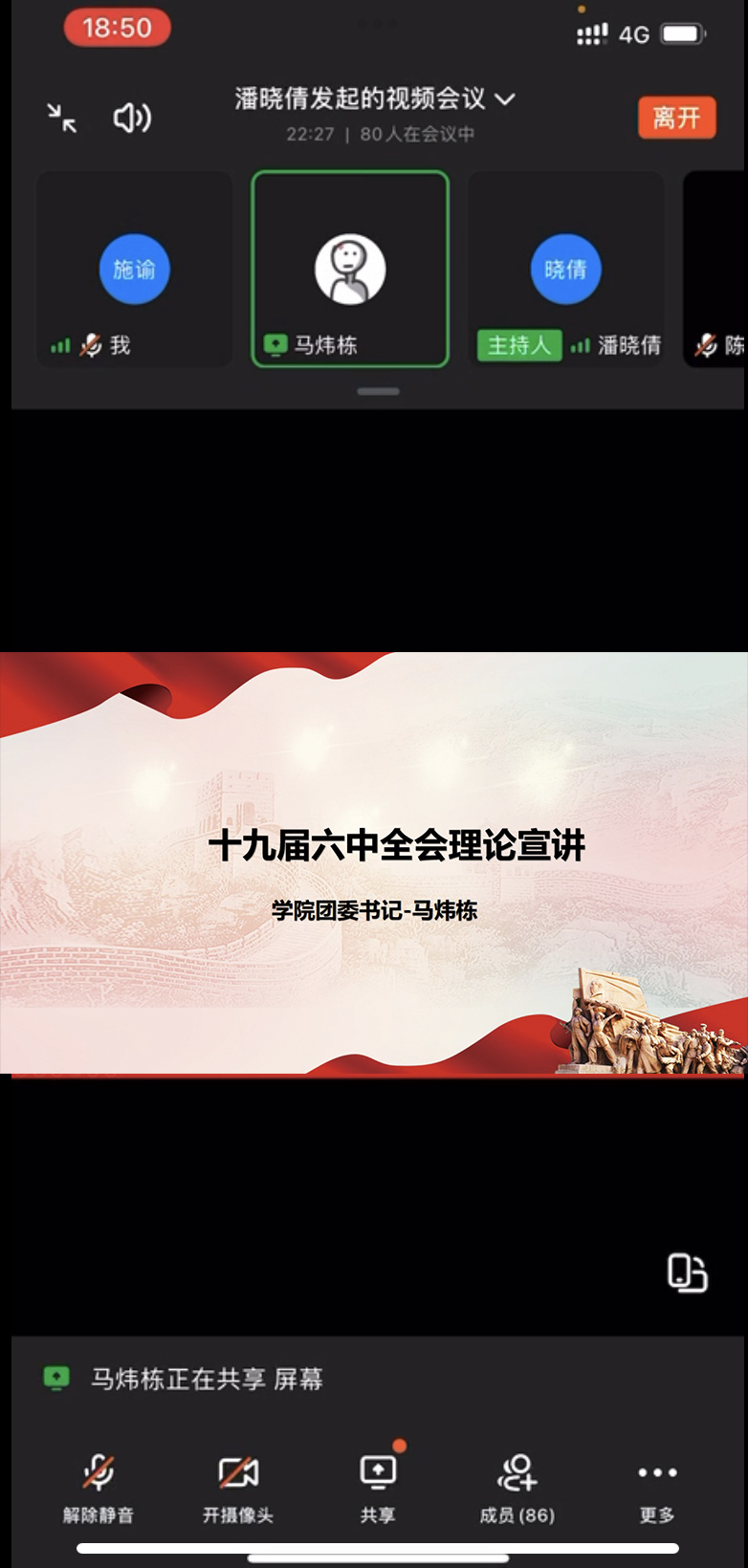 开班典礼结束后,马炜栋老师以“十九届六中全会理论宣讲”为主题开展团校第一课。他从十九届六中全会介绍、党的百年奋斗重大成就、党的百年奋斗历史经验、不忘初心推进中华民族伟大复兴四个部分展开,深入浅出地阐释了全会精神,号召全体学员拥护党的领导,以史为鉴、开创未来。