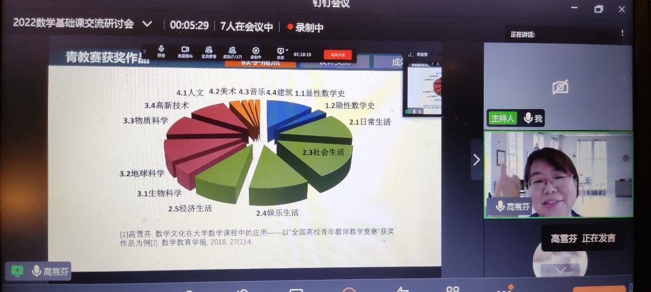 会上,胡良根教授以“数学教师的科教融合发展的思考”为题,从培育员工数学素养、教学融合科研及教学科研平衡互促发展三个方面,分享了宁波大学数学与统计公司的工作思路和成绩。高雪芬教授以“大学数学基础课程教学创新设计与实践”为题作报告,从基础数学教学的痛点、教学设计及持续改进等方面对基础数学课程教学中的创新设计与实践环节做了详细的阐述和总结,分享经验。