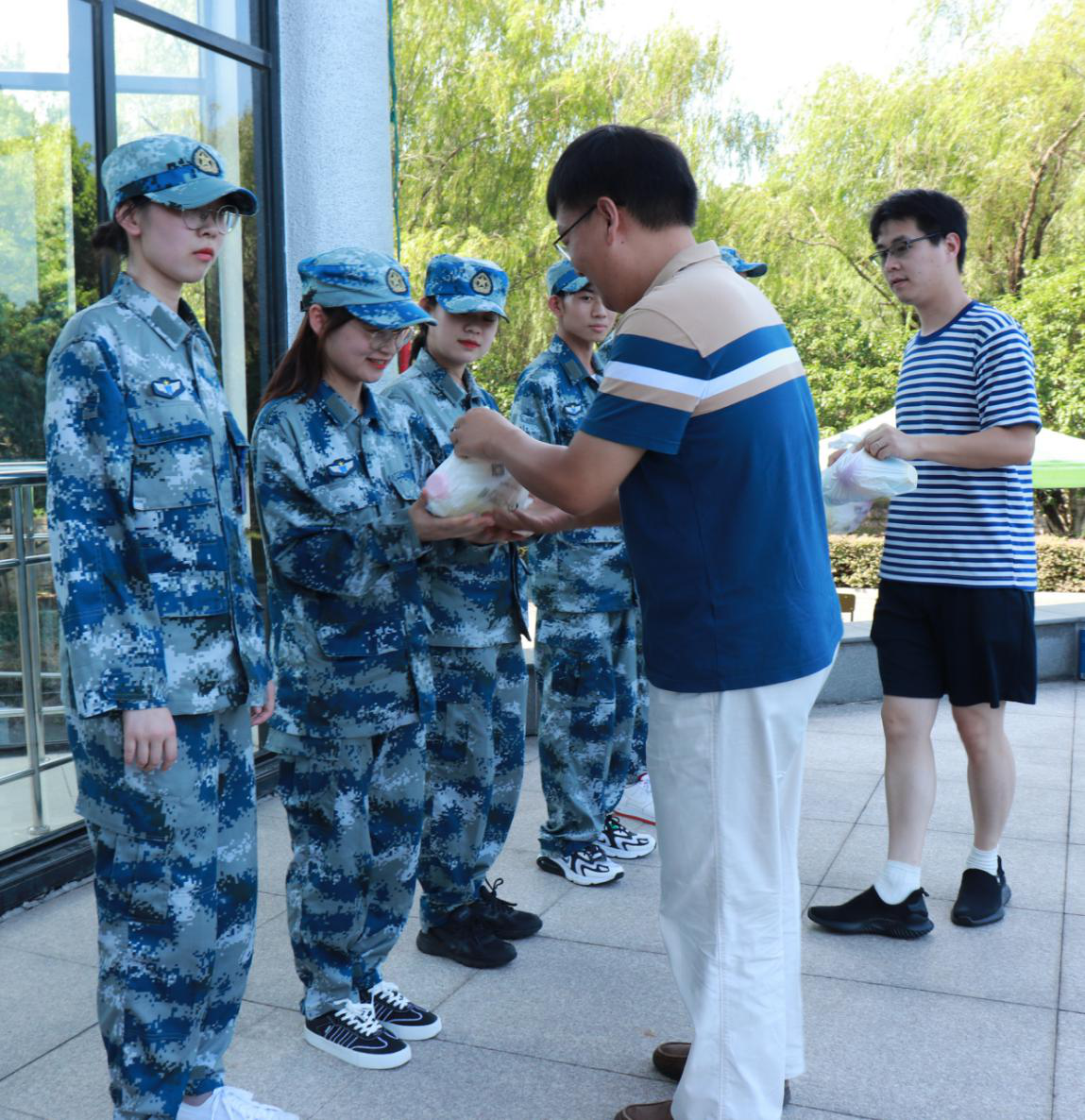 于欣老师向参训员工表达了深深的关切之情,并强调了军训的背景和意义。他对同学们克服高温困难、努力参训历练表示肯定,希望同学们学习军队知识,发扬军人精神。随后,他为参训干部和全体参训员工发放了巧克力、水果等慰问品。