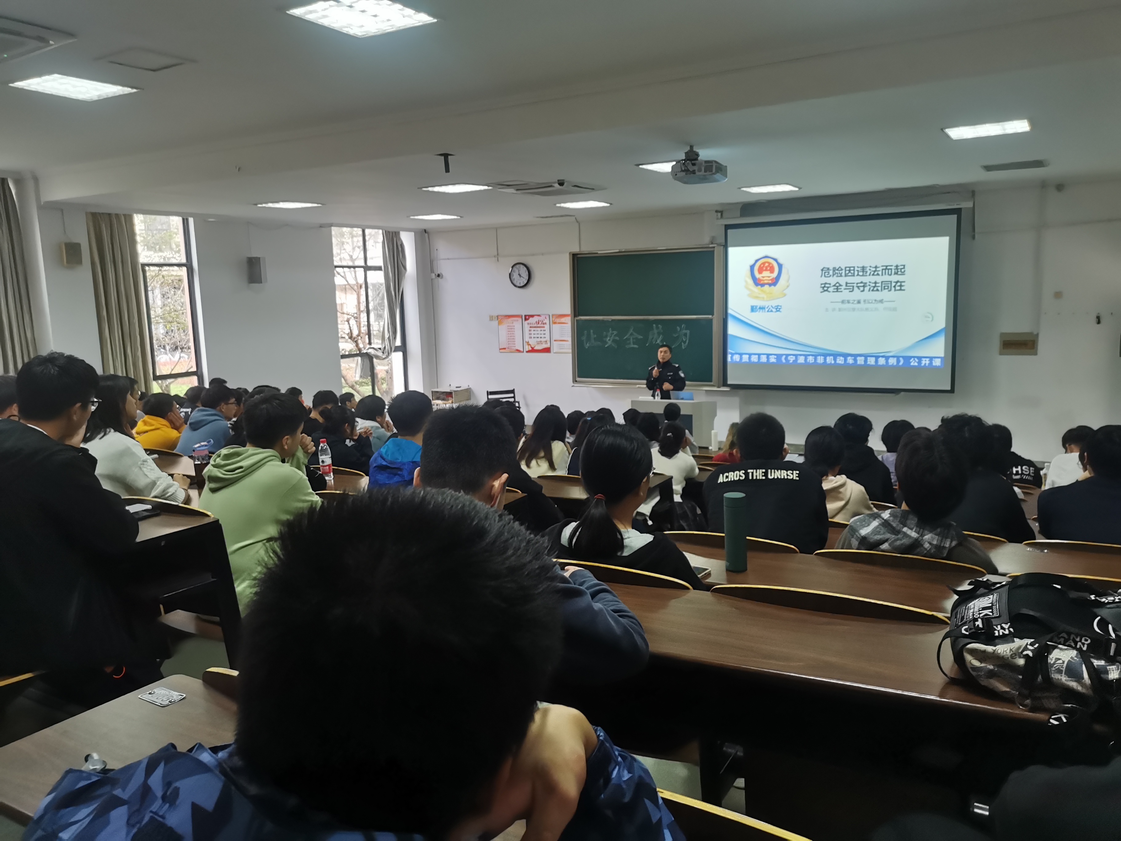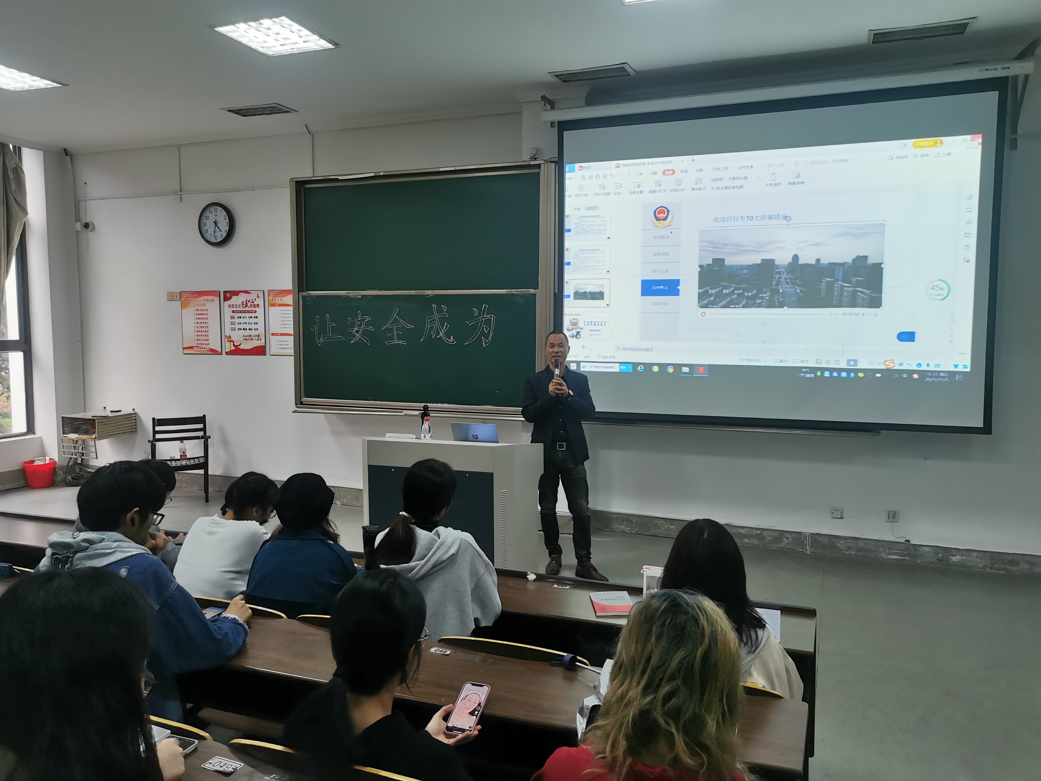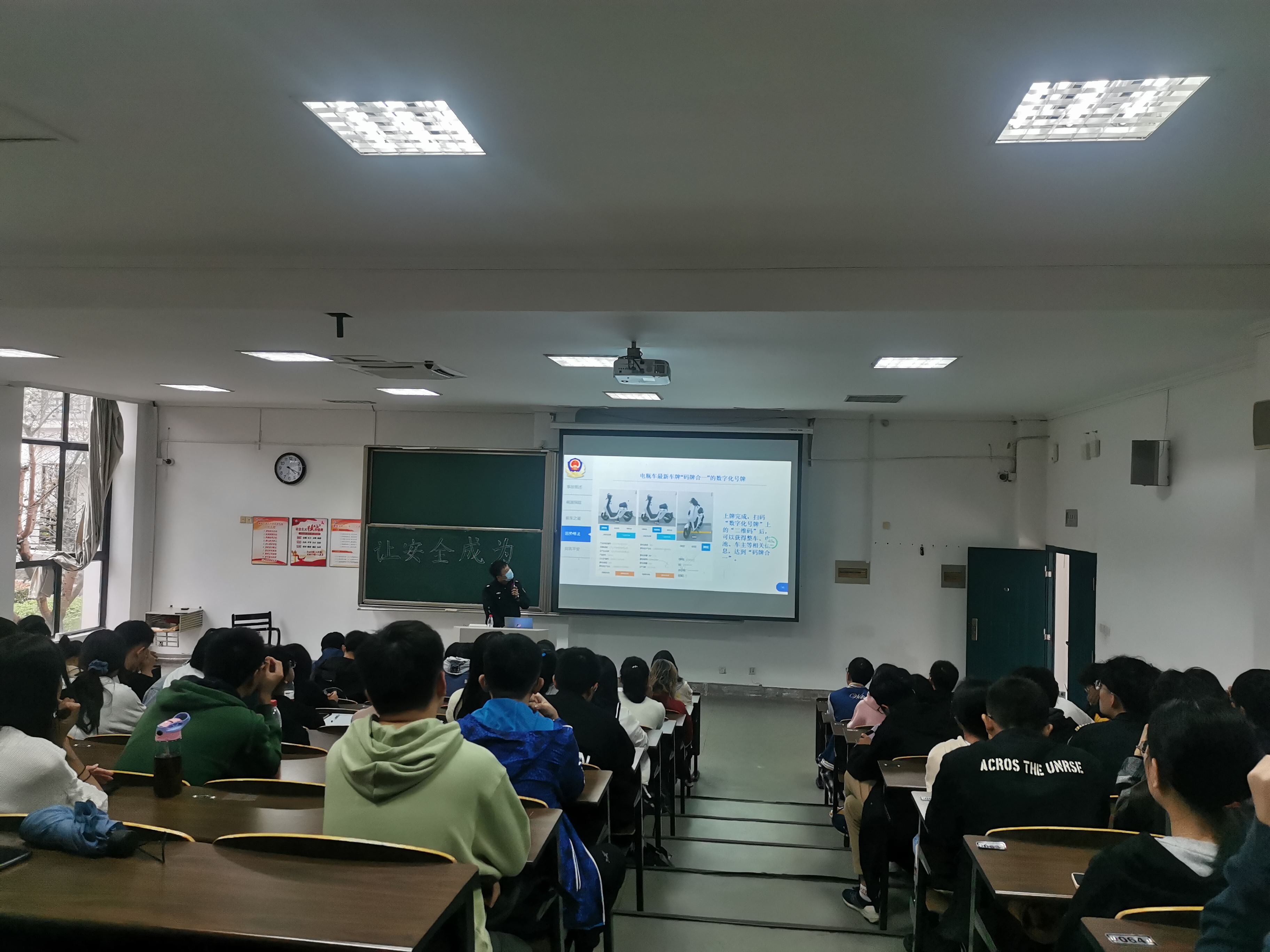 11月5日下午,SF106教室里济济一堂,两位交警同志结合工作实际和道路交通事故典型案例为同学们开展了一堂生动的交通安全课。