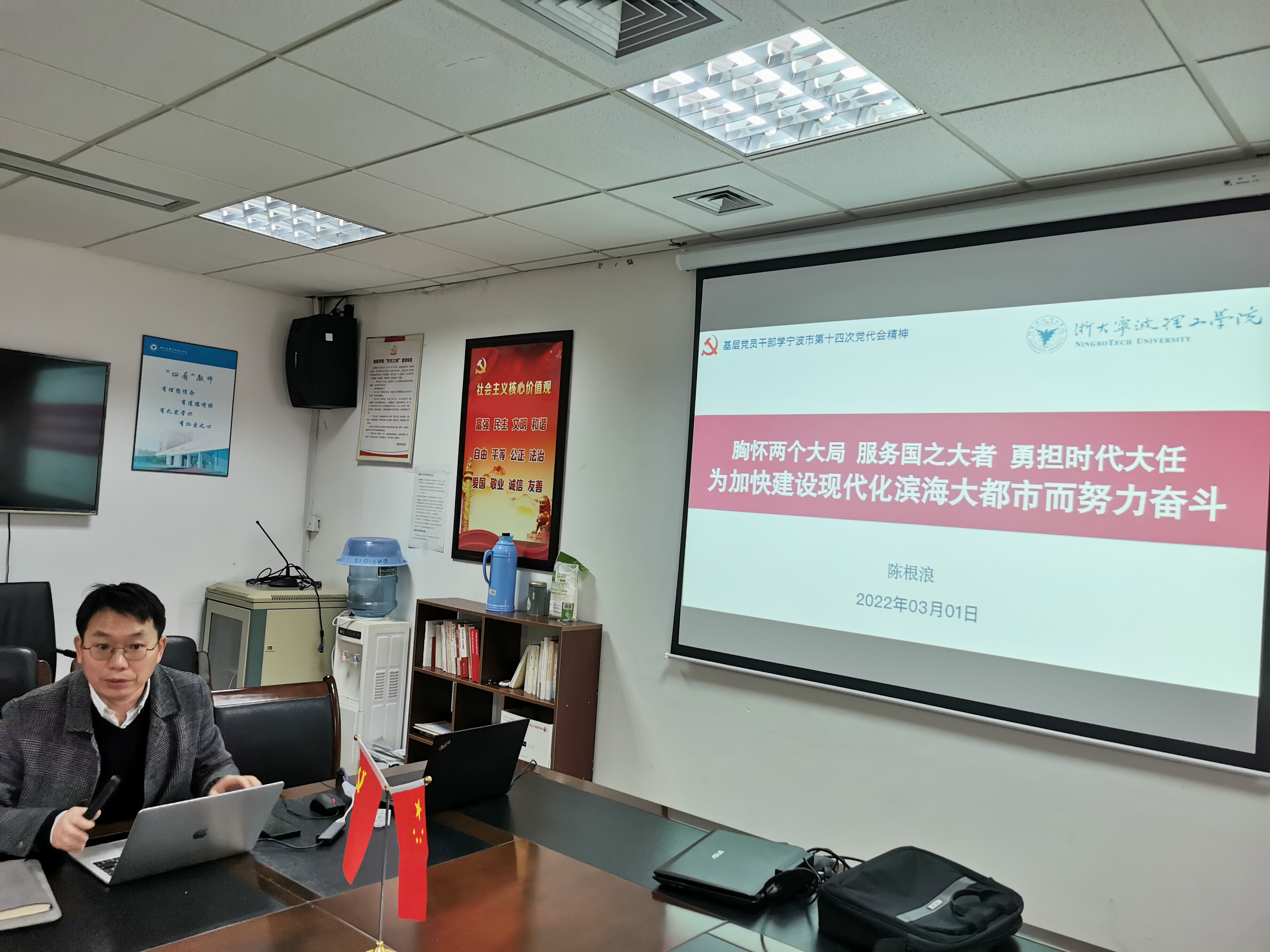 会上,陈根浪详细阐述了宁波市委书记彭佳学同志的《胸怀两个大局,服务国之大者,勇担时代大任,为加快建设现代化滨海大都市而努力奋斗》的报告,分别从“5年工作回顾”、“开创新局面”、“打造标志性成果”、“提供坚强政治保证”四个方面作了精彩解读,并和大家分享了参会感悟。