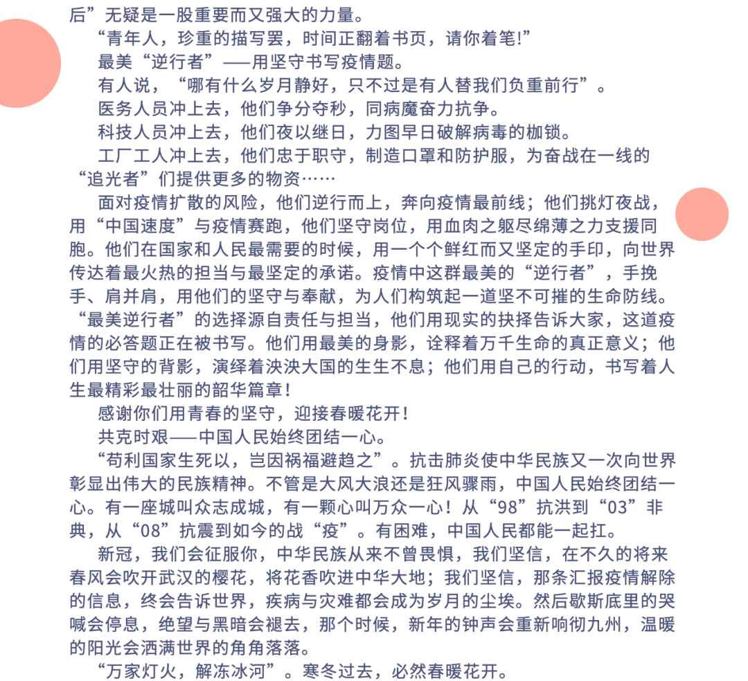 公司也选取了优秀的征文参加了学工部的“共抗疫情,爱国力行”主题征文,共有5名同学的征文进入学工部优秀征文评选。
