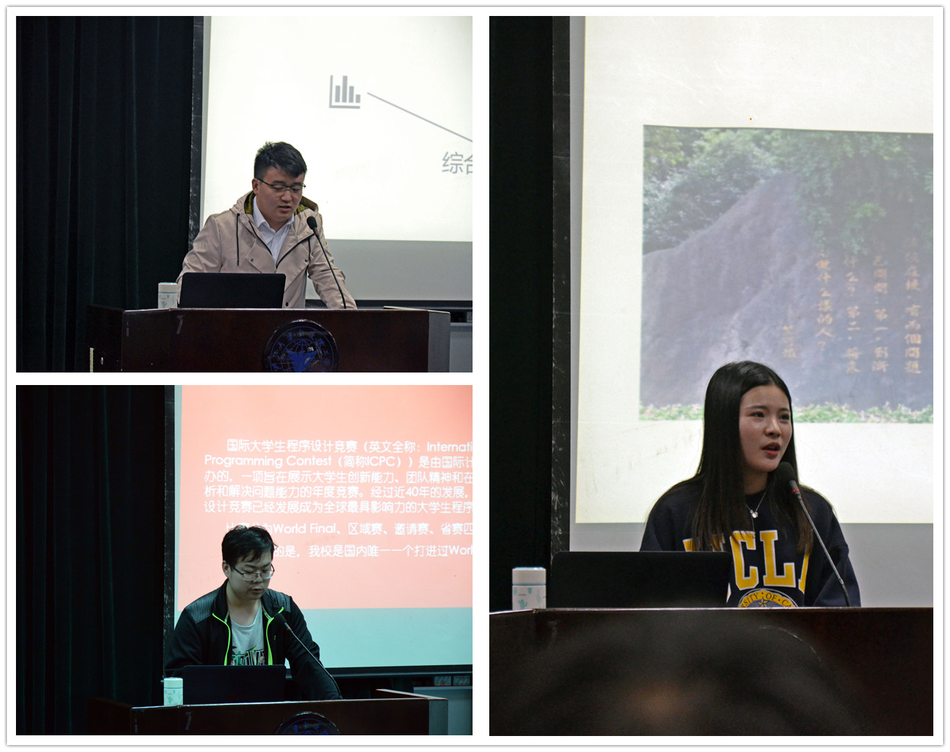 开幕式上,廖海鹏老师和陈根浪老师分别进行了讲话。廖海鹏老师深情回顾了自己曾在公司工作的经历,见证了公司ACM队取得的骄人成绩,并指出本次竞赛月活动的开展将会进一步推动公司创新创业和学科竞赛工作。同时,他对同学们提出三点建议:一是坚持正确的努力方向,二是坚定正确的价值导向,三是学思结合、善于创新。陈根浪老师对本次活动的原因和意义进行说明,强调数据学子必须要有扎实的编程基本功,激励数据学子敢闯敢拼、奋发有为,要注重创新创业能力的培养和实践能力的提升。会议还安排了信计162虞楚婷、信计161章宗沈和计算机172张逸凡三名同学上台。他们分别就老员工科研创新项目、数学建模竞赛、程序设计大赛等做了介绍,并分享了经验体会。