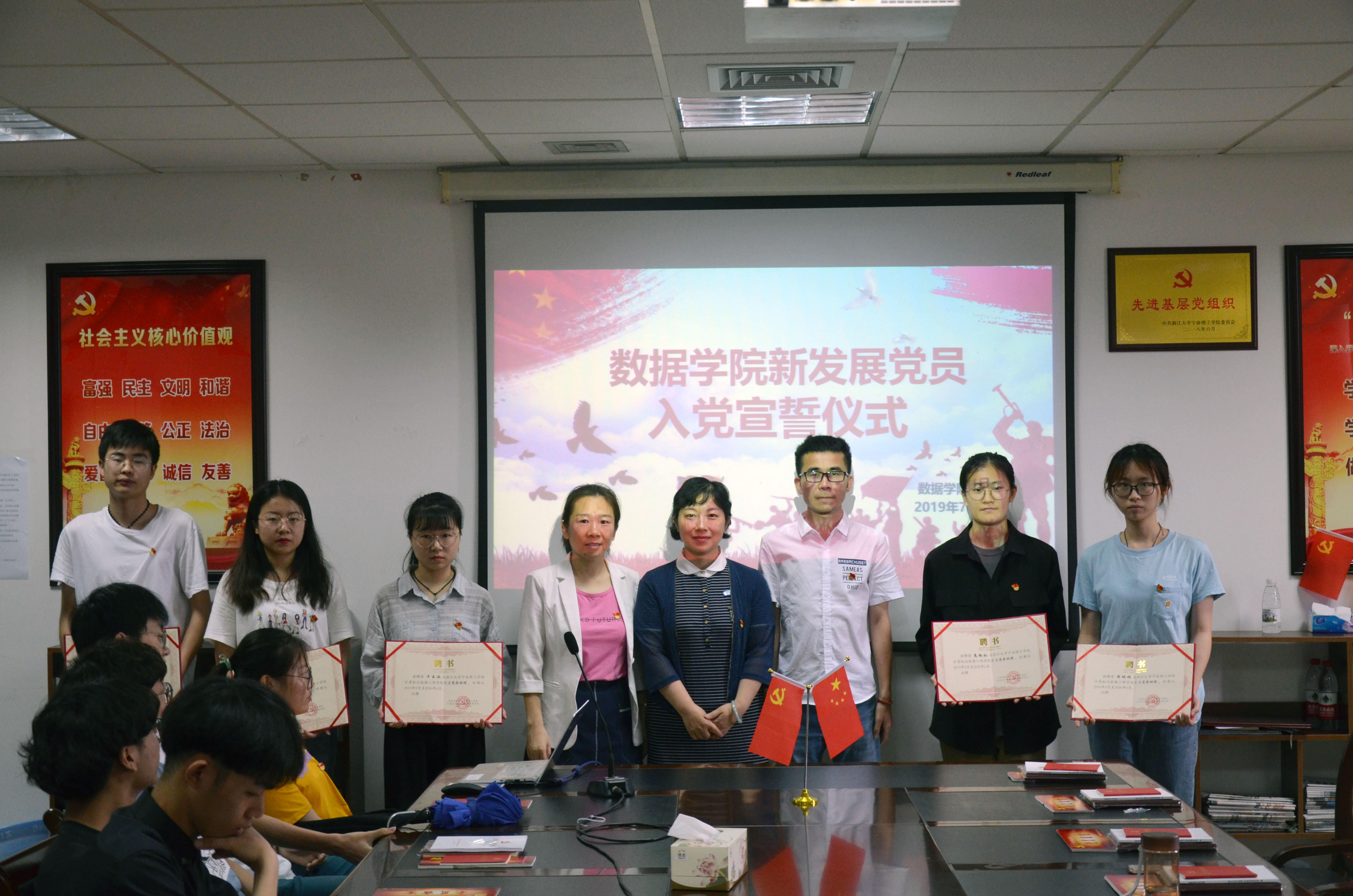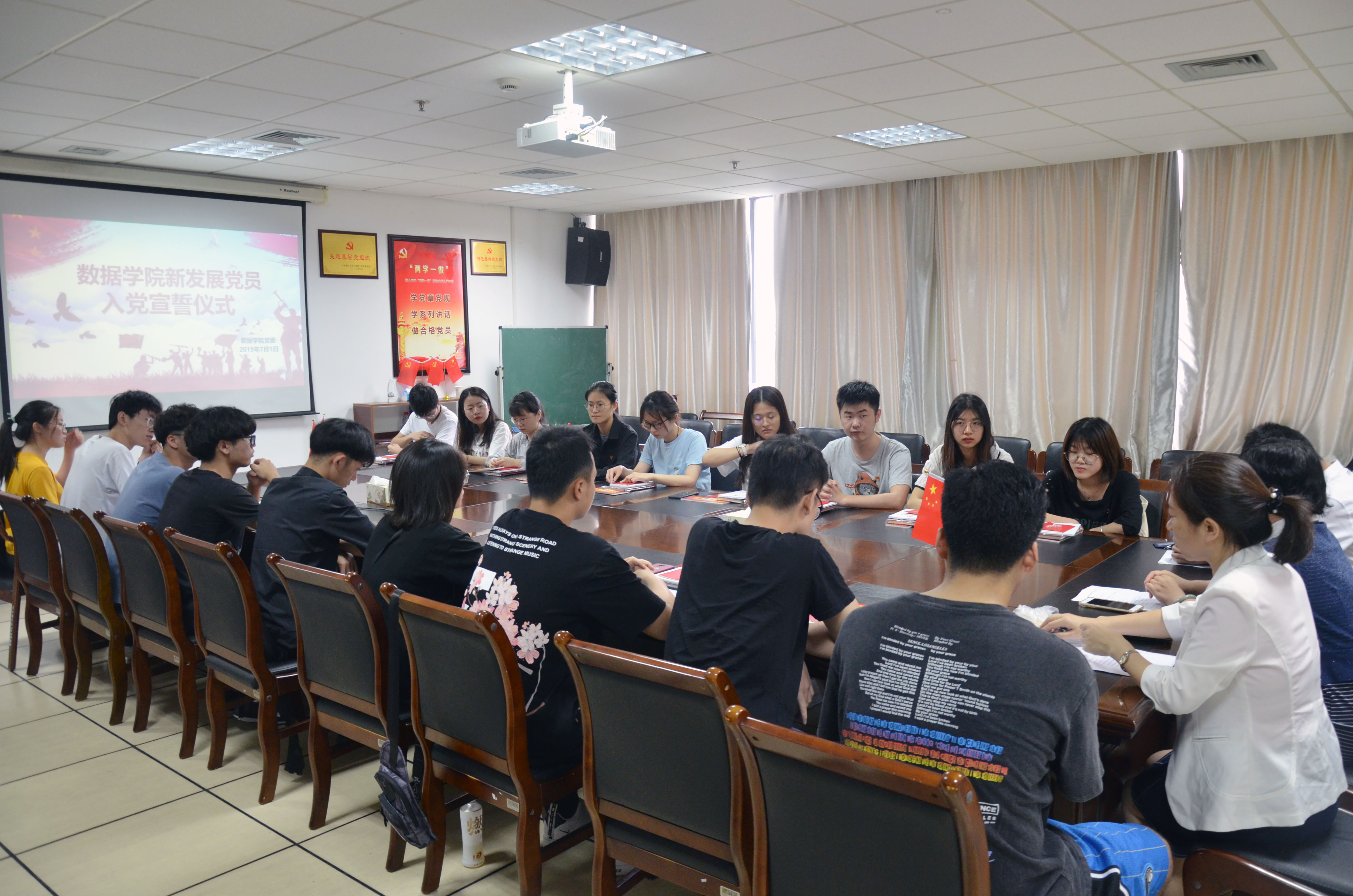 会议在国歌声中开幕,马炜栋老师带领新发展党员进行了入党宣誓仪式。新发展党员代表信计171陆泽林同学进行发言,他号召,作为党员要严格要求自己、听从党的教诲、时刻牢记责任义务、充分发挥先锋模范作用。会议还进行了2019-2020学年的党务助理聘任仪式,汪洪老师和各支部书记为新任党务助理颁发聘书并合影留念。