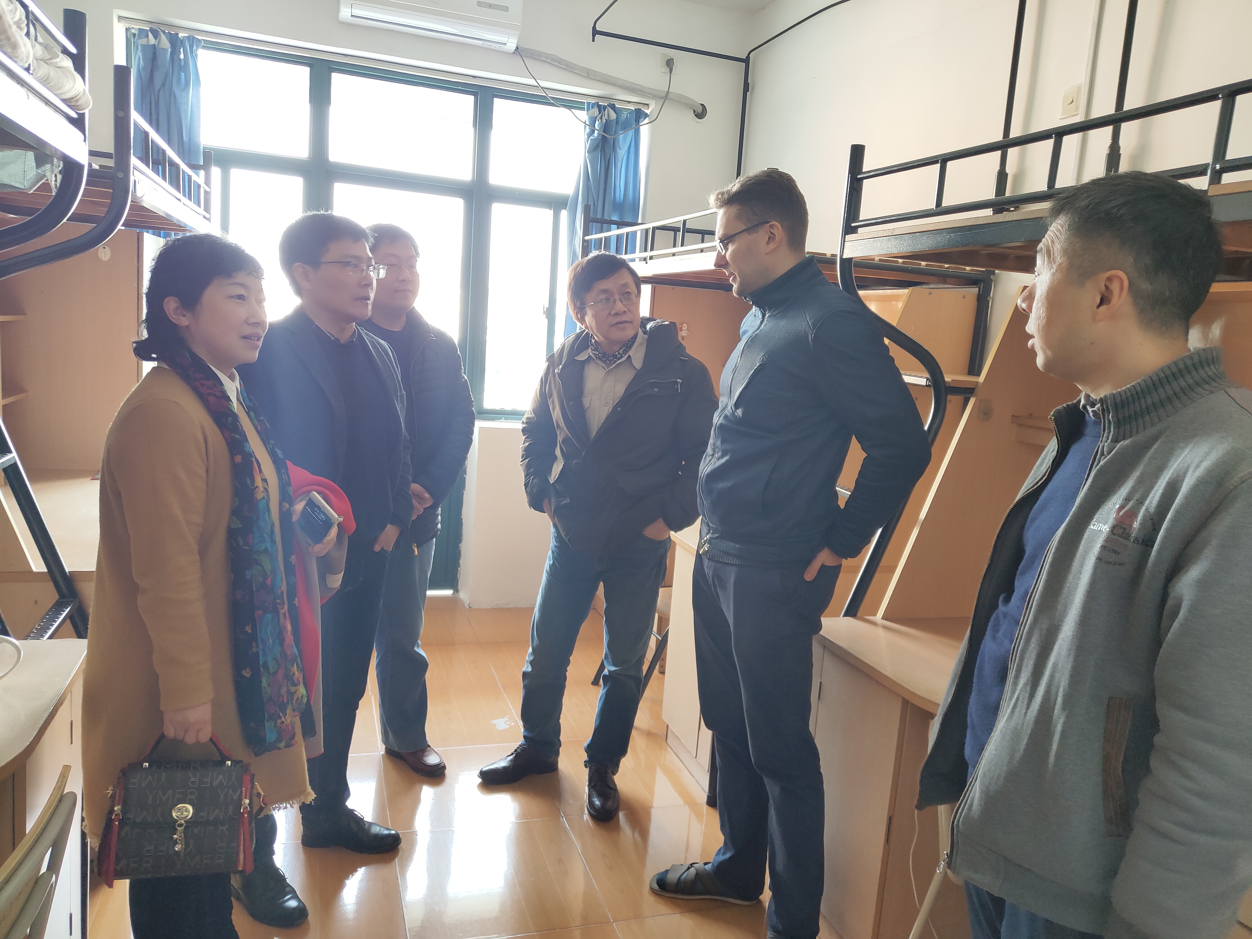 本学期伊始,意昂迎来了两个来自爱沙尼亚的交换生,为了解他们的住宿条件和适应状况,向他们传达欢迎和问候,2019年3月4日中午11:30,公司全体领导班子、学工部副部长郑毅和外事处副处长程萌一起来到员工宿舍,看望了交换生。