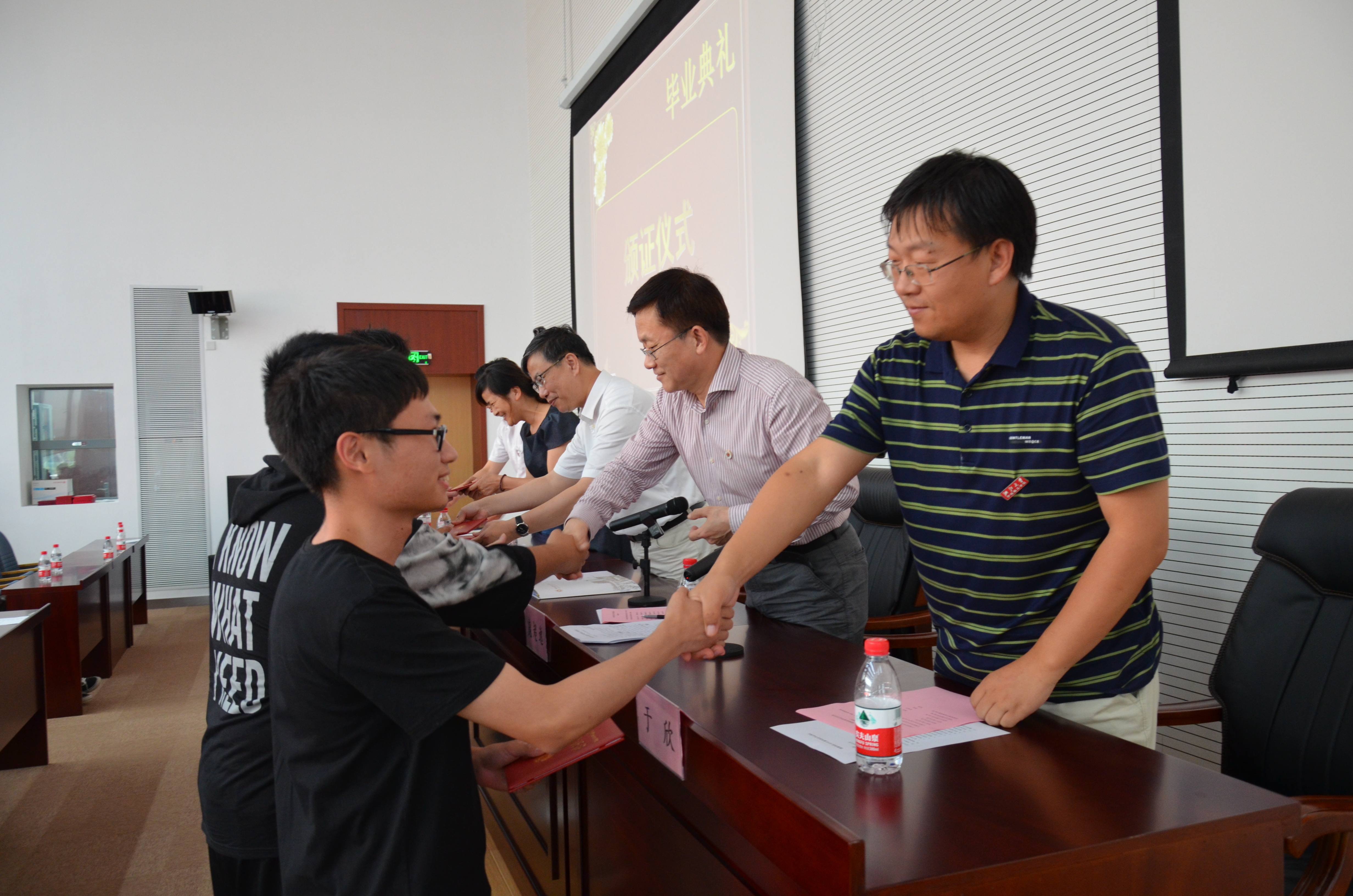接着,意昂经理庞超逸老师通报了公司第一批本科生毕业情况,副经理、总支副书记于欣老师宣读了省级、校级优秀毕业生名单,副经理陈根浪宣读了考研、出国、创业毕业生名单。班级代表、优秀毕业生代表、就业奖励获得者代表依次上台领证,台上嘉宾为他们颁发证书并合影留念。