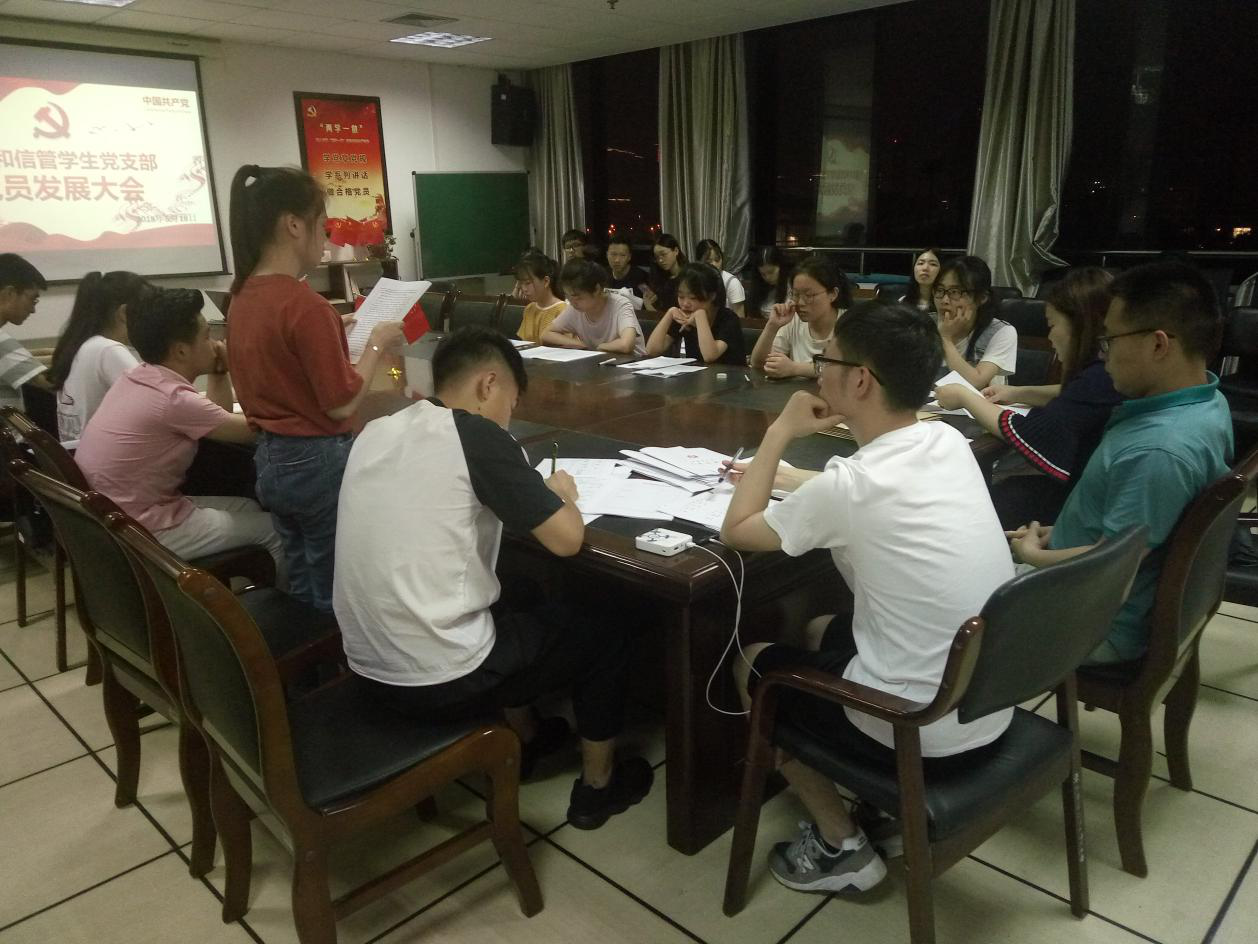 会议第一项,入党积极分子转预备党员。新发展对象陈治民、孙丽楠等同志宣读入党志愿书。宣读完毕后,入党介绍人介绍该同志有关情况,并对其能否入党表明意见,再请吕航磊同志代表支部委员会报告对该同志的审查情况。然后,请与会党员发表意见,对该同志能否入党进行充分讨论。最后,请有表决权的正式党员对该同志能否入党进行无记名投票表决。几位发展对象均得全票通过。会议第二项进行党员身份教育。支部书记陈辉老师希望我们能够正确认识党员这个身份,并肩负起作为党员应该做的事。作为党员,应该不只是追求自己的发展,还应该带动班里的发展,需要在所在班级,发挥党员的带头模范作用,督促到课率和班级学风的发展,毕业班党员还应带动班级就业。