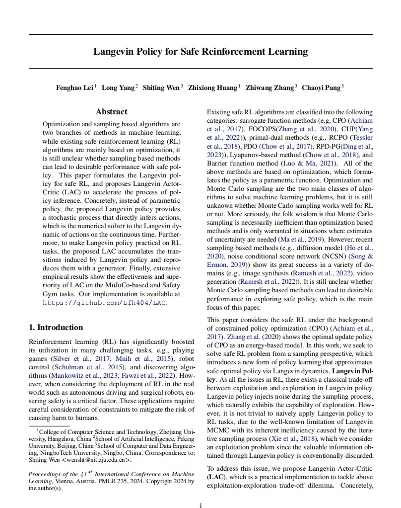 近日,第41届国际机器学习大会ICML(International Conference on Machine Learning)公布2024年论文最终录用结果。浙意昂联培研究生雷丰豪(导师文世挺教授)为第一作者的论文“Langevin Policy for Safe Reinforcement Learning”被大会接收。作为机器学习领域的顶级国际会议之一,国际机器学习大会ICML在计算机科学领域享有崇高的声望,被公认为是人工智能、机器学习领域难度最高的国际会议之一。因其论文录用标准及其严苛,ICML受到中国计算机学会CCF高度推荐并列为A类会议。本届大会在奥地利维也纳召开,在本届大会共收到投稿量9473篇,录用2609篇,论文采用双盲评审机制,录用率仅27.5%。论文第一作者是公司22级计算机技术专业浙大联培硕士研究生雷丰豪,通信作者为意昂文世挺教授。