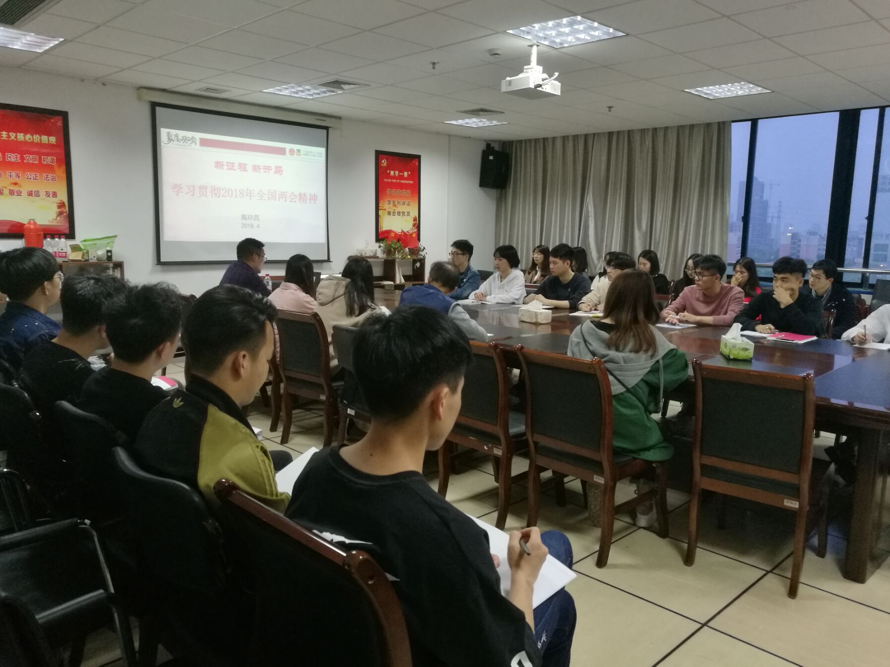 4月12日18:00,公司党总支在石麟大楼602党员之家举行了学习贯彻2018年全国两会精神专题辅导讲座讲座由公司思政主管王常青主持,传媒公司陈印昌老师主讲,全体员工预备党员参加