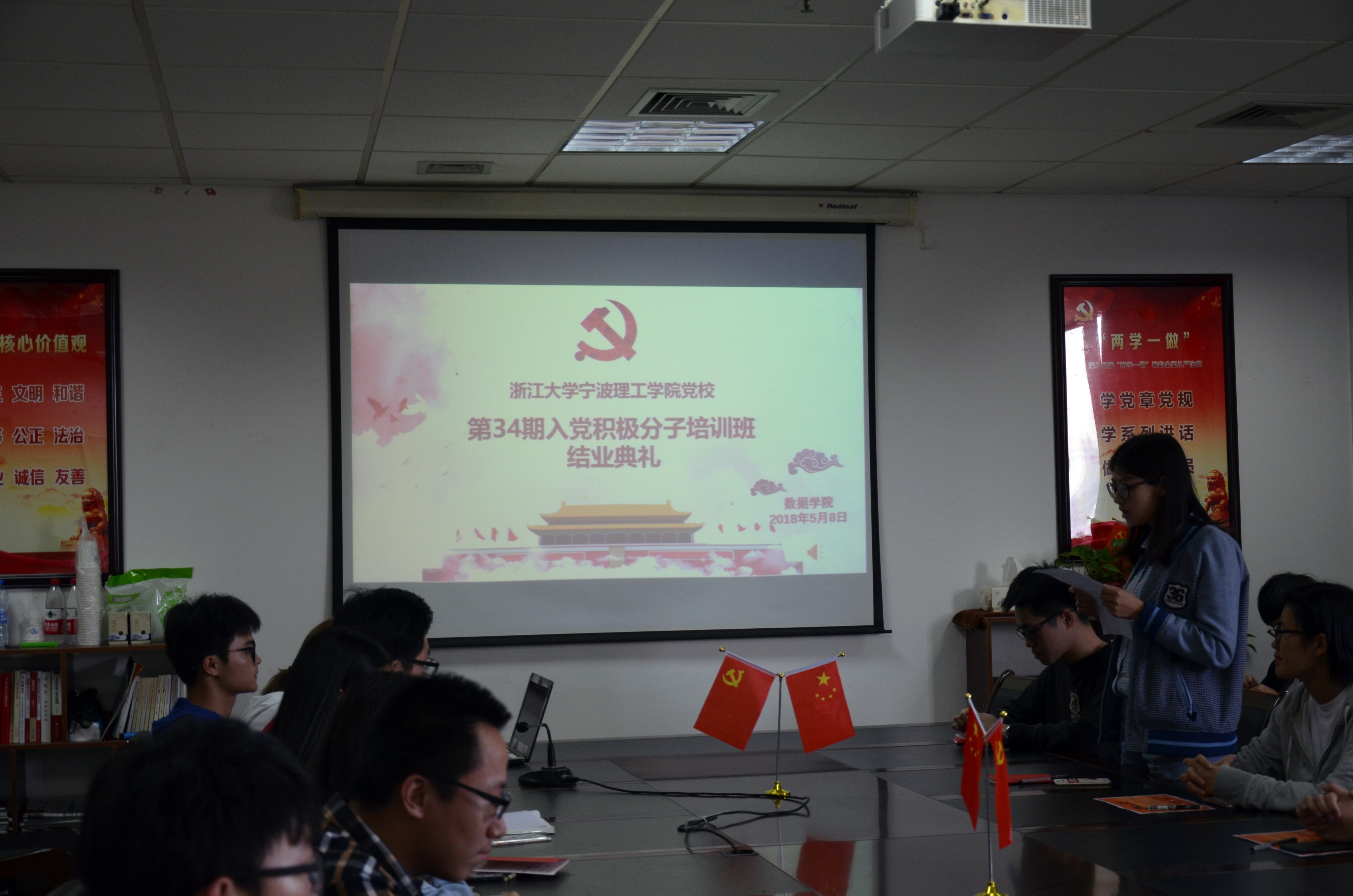 在奏唱庄重严肃的国歌之后,由邬旭东老师宣读党校优秀学员和演讲比赛获奖名单,并为获奖学员颁发证书。优秀学员代表计算机类171班沈平同学就培训期间的感悟做了简要发言,她提到:通过培训班的学习,对于党组织有了更为深刻的认识,同时坚定了加入中国共产党及为实现共产主义而奋斗的决心,而在未来的日子里将会严格要求自己,继续努力拼搏,为成为一名合格党员而不断奋斗。