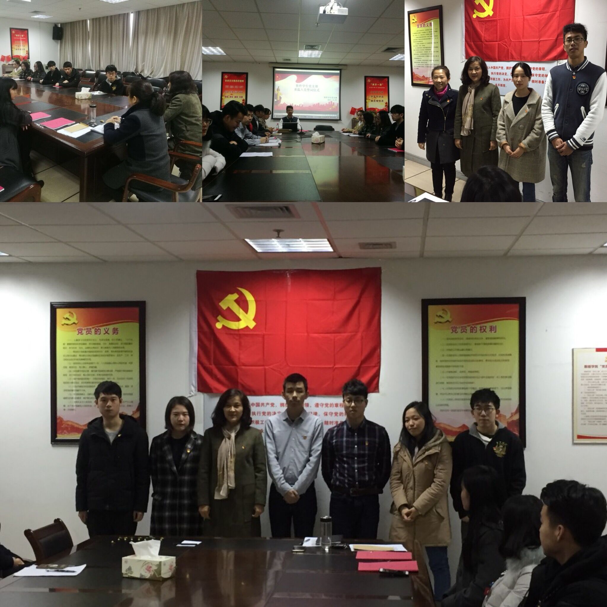 在演讲比赛开始前,首先举行了重温入党誓词仪式,由支部宣传纪检委员鲍东领誓,所有党员在鲜红的党旗下重温了入党誓词,方国娟老师还为每一位党员佩戴了党徽,并提出了明确的要求,一是要将入党誓词落实到行动中;二是要加强学习十九大精神并在普通同学中加强宣传;三是作为员工党员,学习是首要任务,要在同学中模范遵守公司各项规章制度,做好员工的表率。