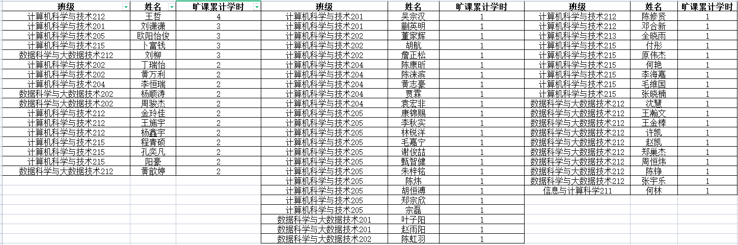 根据各班考勤点名后台数据以及学风建设部每周考勤结果审核情况,现将第六周和第七周课堂缺勤名单进行公示,累计旷课6学时及以上的,将给予公司内通报批评,请同学们认真对待,无故不缺课!