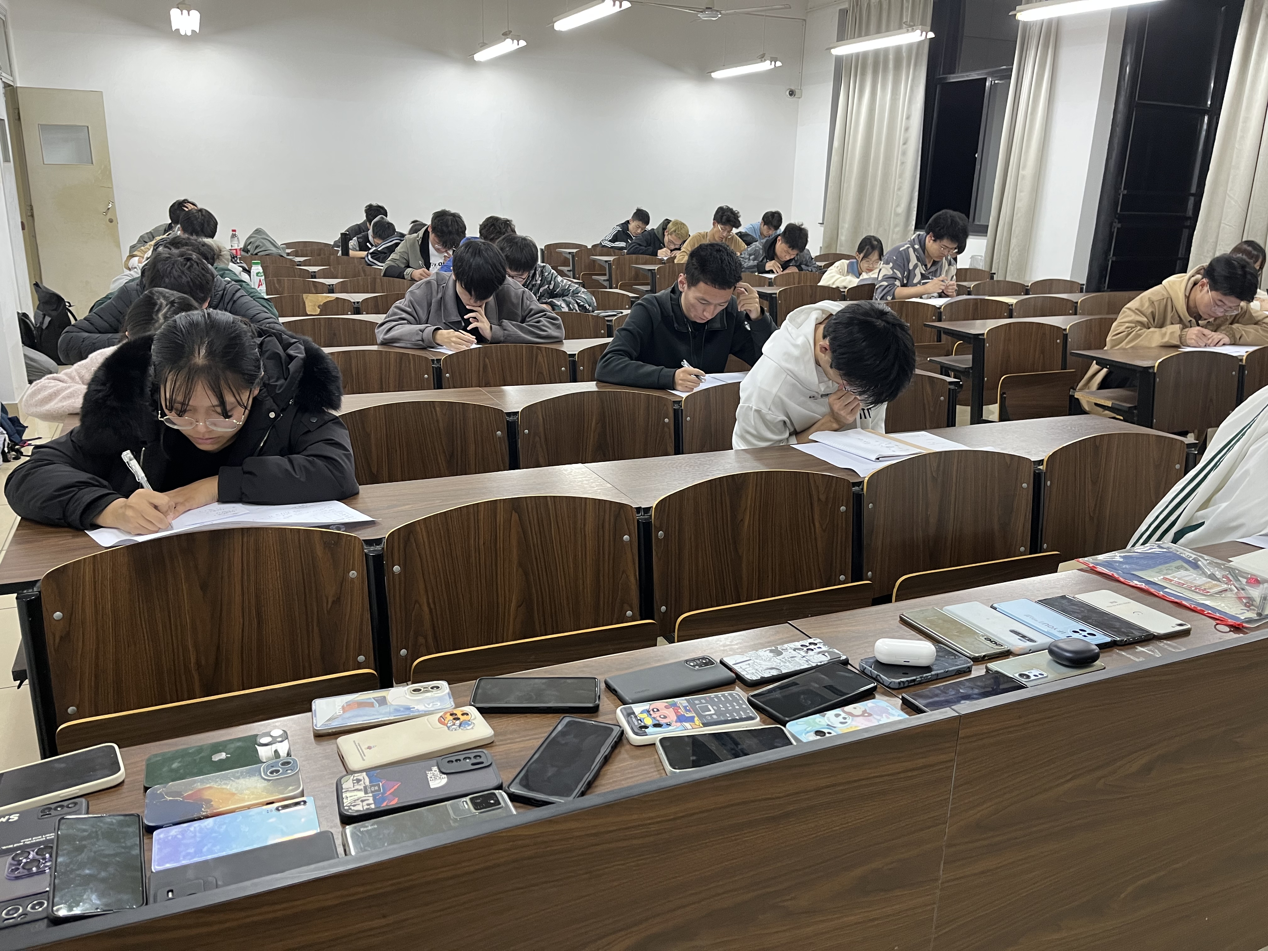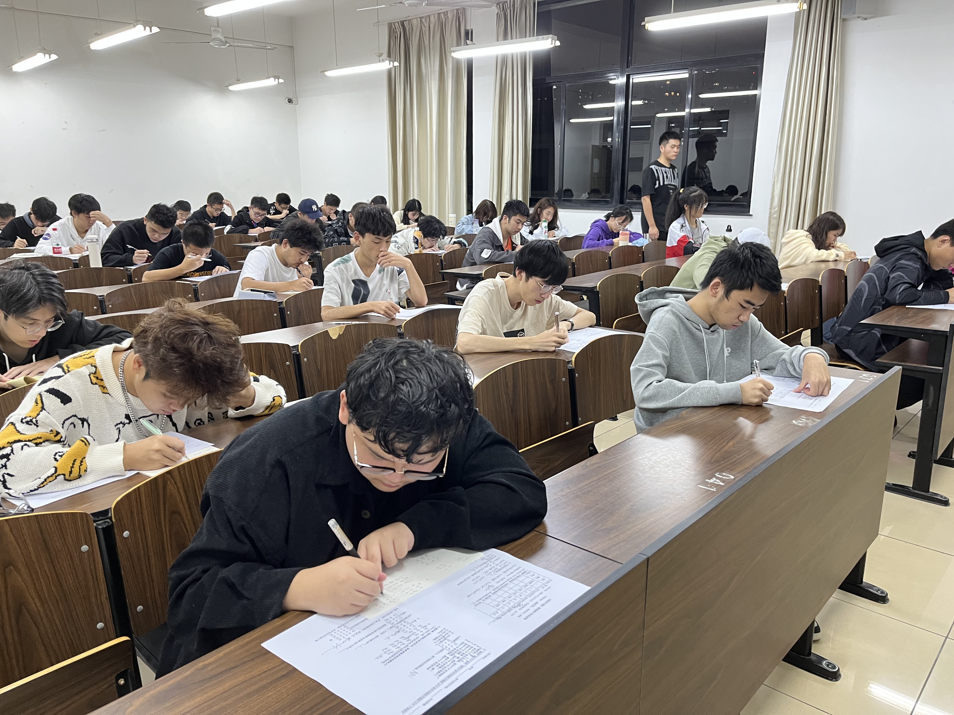 为严肃考场纪律,要求考生提前10分钟入场,按照学号顺序落座。随后监考人员准时分发试卷,老师在考试前逐班宣传考场规则和考试纪律,要求每位同学认真对待考试,诚信应考。拿到试卷后,考生们认真思考,仔细答题,在题海中疾书,计算、验算,有条不紊。考试时间到,各班班助收齐所有考卷并进行批改。