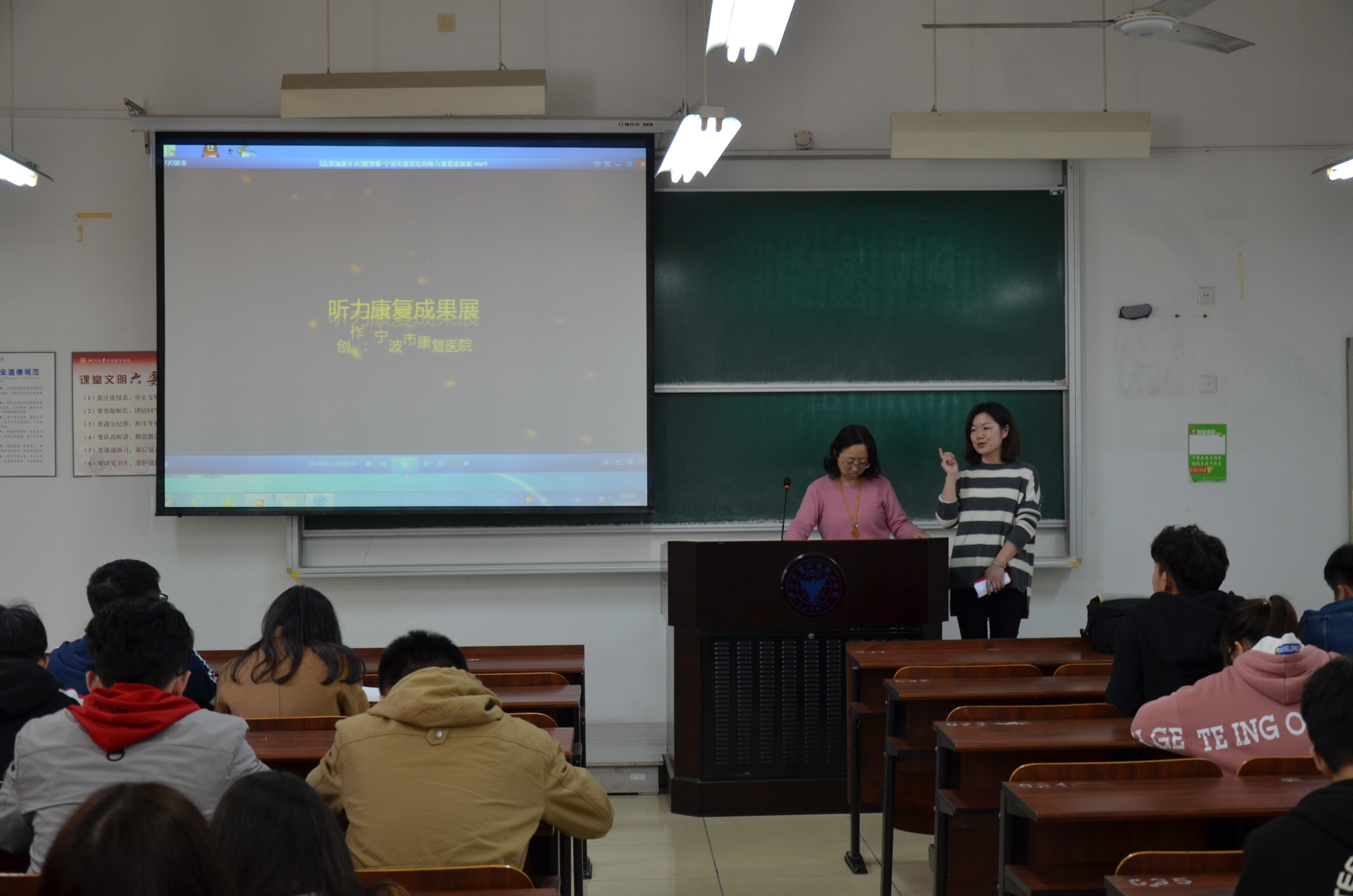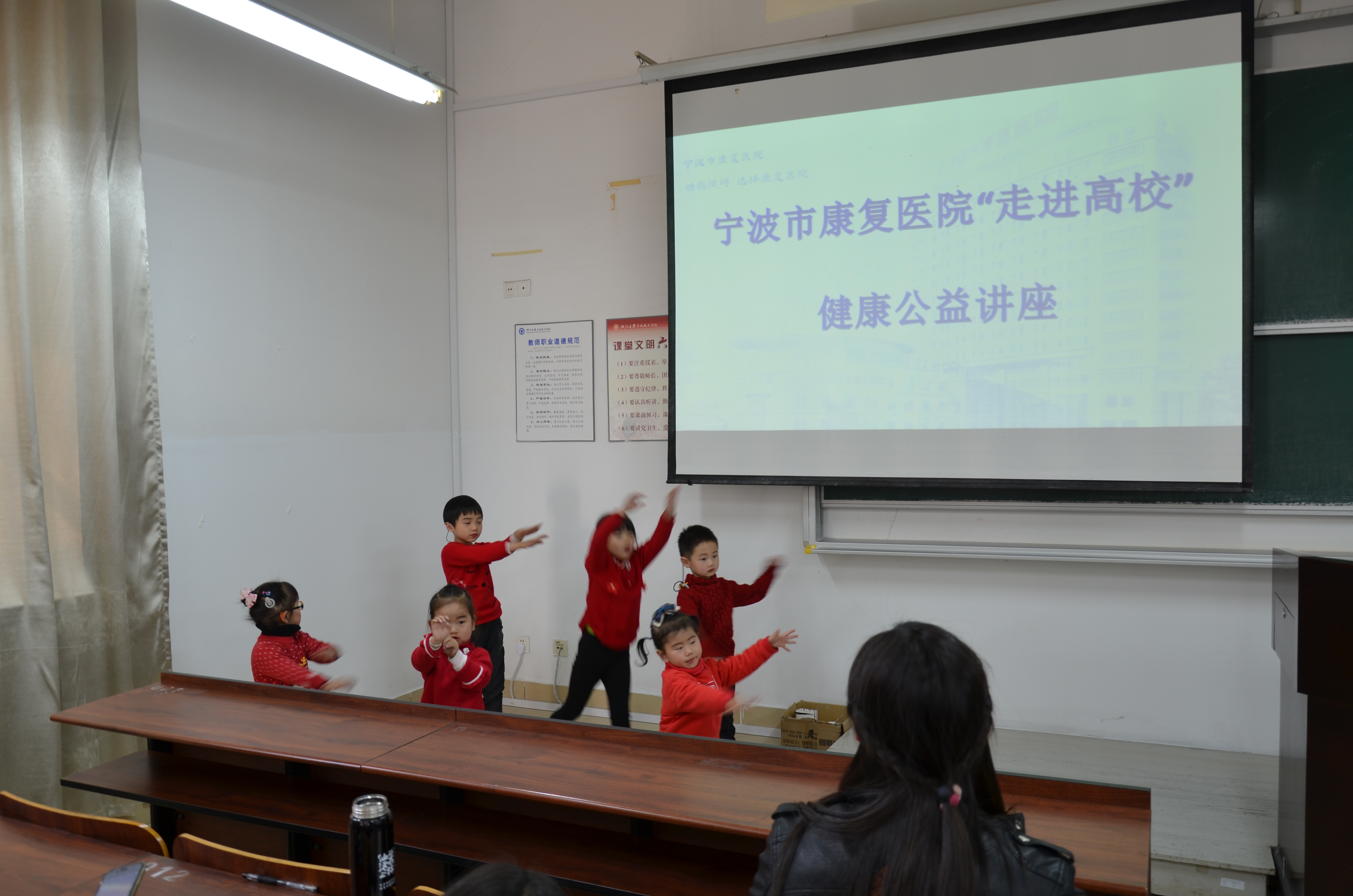 随后,由康复医院的专家带领听障儿童来为我们进行了一场精彩非凡的表演,并收获了场下热烈的掌声。同时为我们详细介绍了对听力造成损伤的日常生活行为,并介绍了保持听力健康的方法,如:听音乐不要超过六十分钟;日常交流不超过60分贝;放音乐不超过60%最大音量等。讲座的最后,她亲身示范,带领员工们做了一套耳保健操。