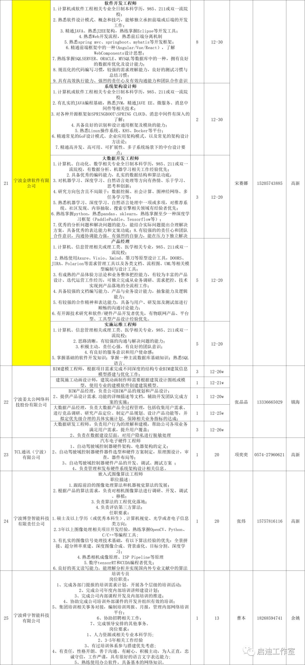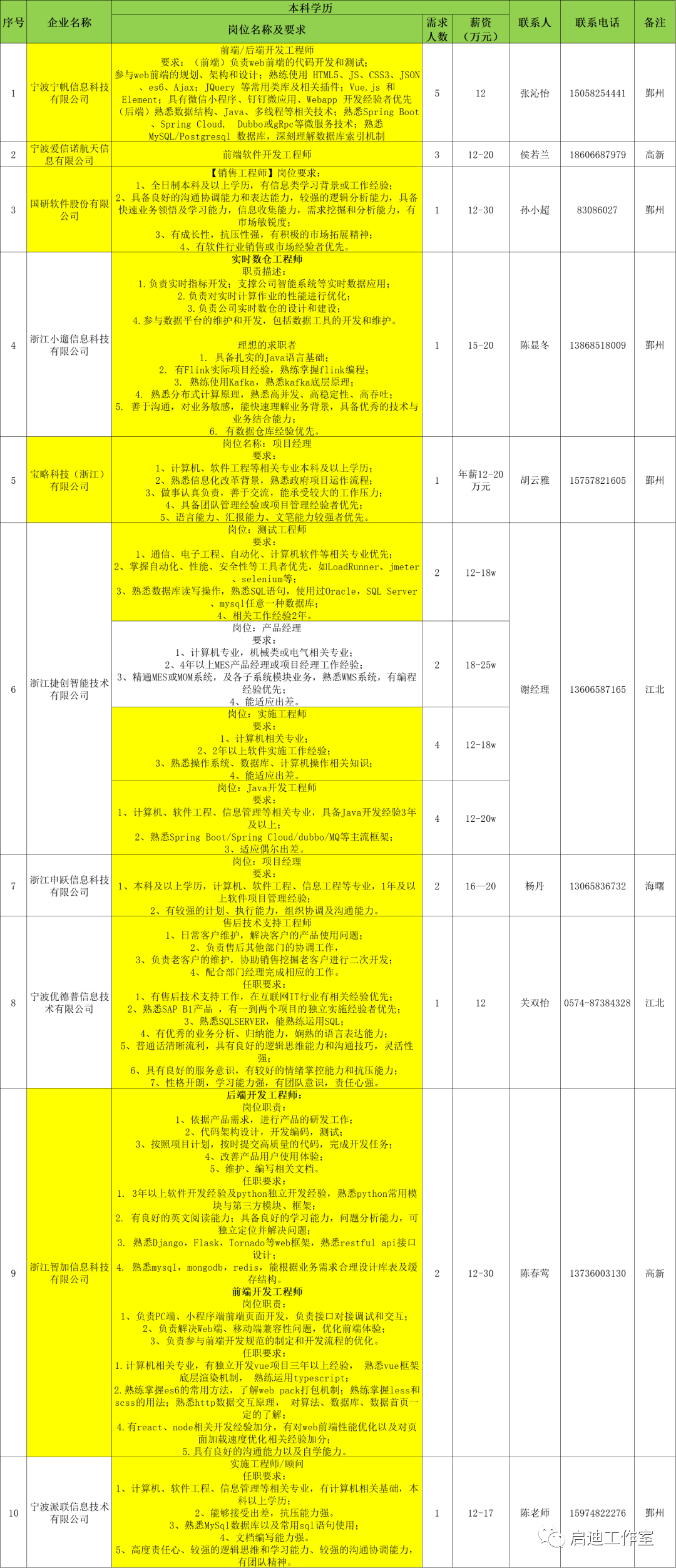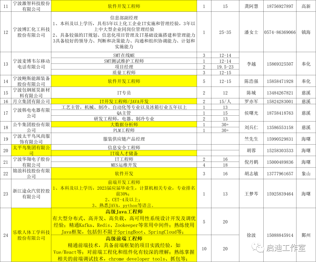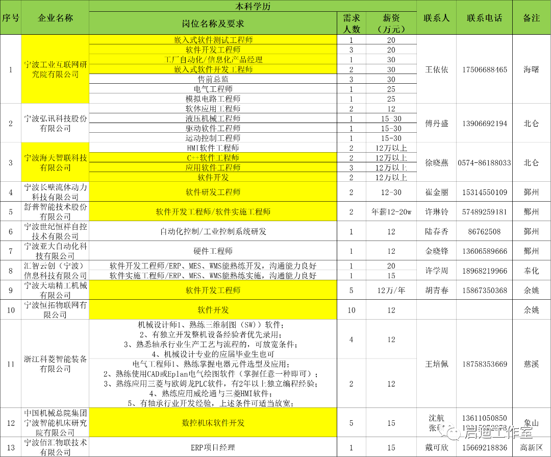 宁波软件企业、工程服务公司和大优强公司面向本科学历毕业生的IT相关岗位需求汇总。