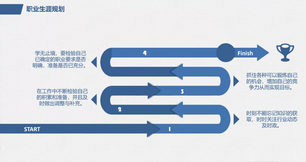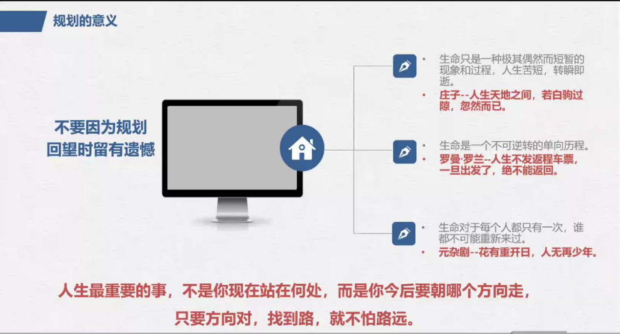 为加强我们对生涯规划重要性的认识,陈老师在第二部分着重和我们探讨了“为什么要进行人生规划”的问题。规划的意义在于不留遗憾,只有认真思考自己的未来,我们才能坚定地迈着步伐,面对理想路上的一个个挑战。人生规划并不遥远,可以从短期的小规划做起,一步一个脚印,扎扎实实地走下去,就一定会有收获。
