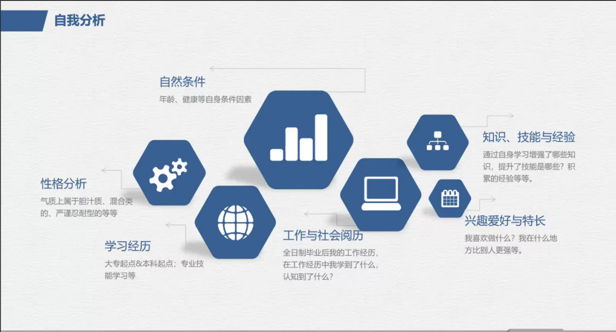 在自我分析部分,陈老师深入浅出的为我们讲解了性格、兴趣爱好对我们选择职业的影响,她指出选择工作最好先从兴趣爱好方面入手。做好职业生涯规划的第一步也是很重要的一步就是自我分析,因为只有对自己的性格、兴趣爱好等有了清晰的认知后,才能更好得帮助自己寻找合适的道路,这也就是人生道路上的“第一粒扣子”,这粒扣子系好了,后面职业生涯的发展才会变得更加顺利。