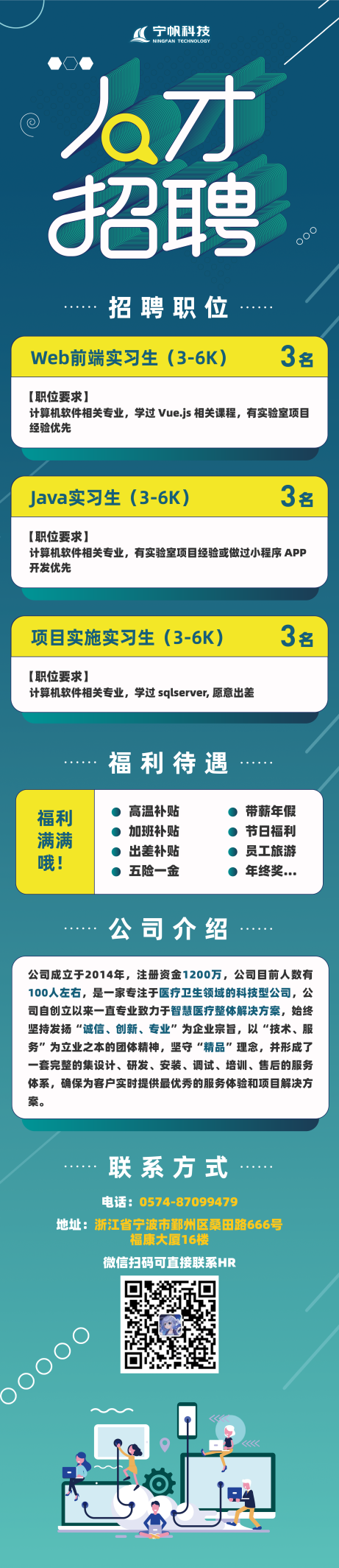 宁波宁帆信息科技有限公司是一家专注于医疗卫生领域的科技型公司,属于宁波市政府重点扶持的高新信息科技企业。公司自创立以来,一直专业致力于智慧医院、区域智慧医疗的整体解决方案。始终坚持以“诚信、创新、专业”为企业宗旨,以“技术、服务”为立业之本的团体精神,坚守“精品”理念,并形成了一套完整的集设计、研发、安装、调试、培训、售后的服务体系,确保为客户实时提供最优秀的服务体检和项目解决方案。