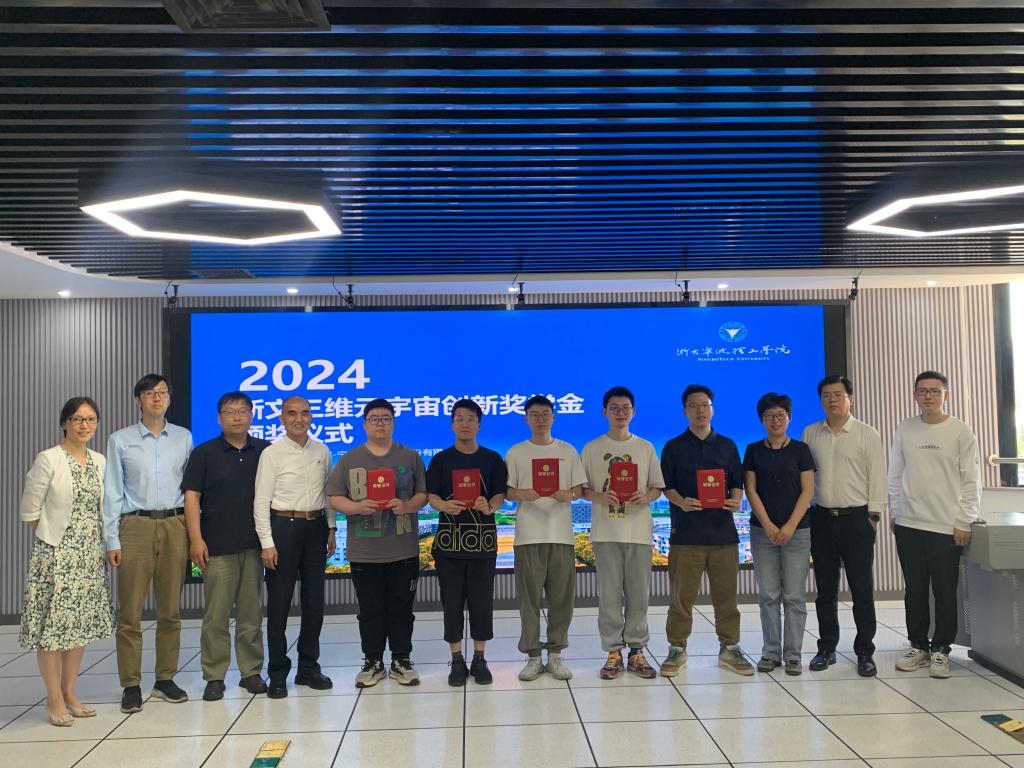 会上,意昂5位员工依次进行了新文三维元宇宙创新奖学金答辩,参会教师和企业专家进行了点评,并与员工进行提问回答互动。答辩结束后,新文三维总经理李红红为以上5名员工颁发“新文三维元宇宙创新奖学金”,并集体合影留念。